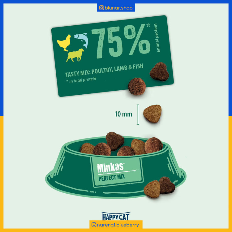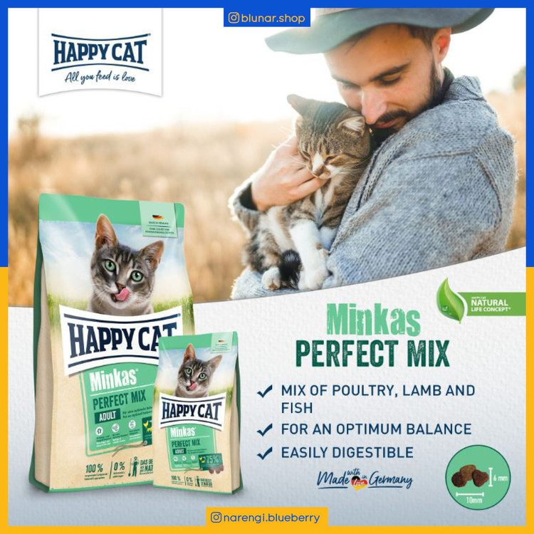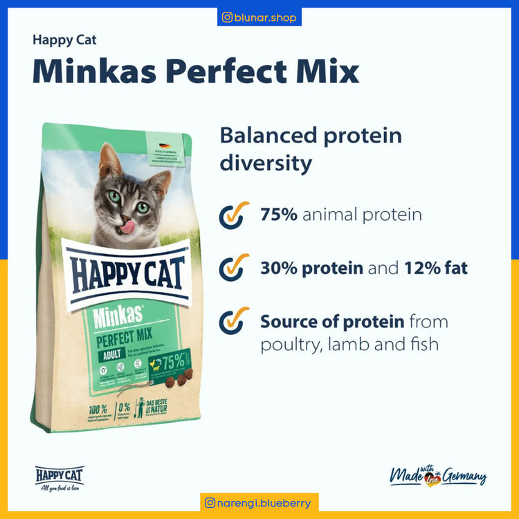هپی کت یک برند معتبر و شناخته شده قدیمی آلمانی است. محصول مینکاس پرفکت میکس ، ترکیب عالی و بینظیری از طیور ، بره و ماهی میباشد. پرفکت میکس باعث کاهش بوی بد مدفوع شده و دارای مقادر مناسبی از اسیدهای چرب و ویتامینهای ضروری است و برای همه گربه های بالغ و سالم مناسب میباشد.