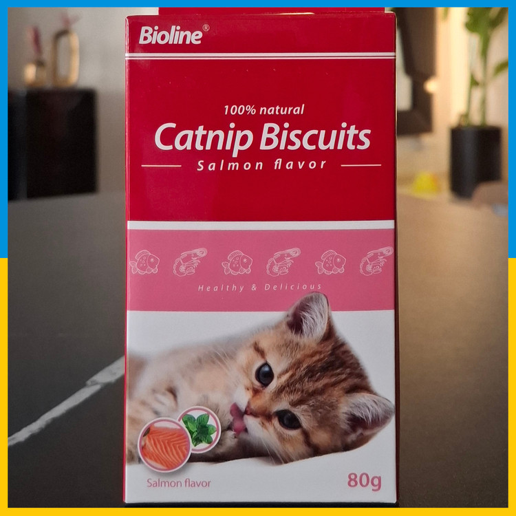 تشویقی بیسکوئیتی گربه با طعم کتنیپ و ماهی سالمون بایولاین